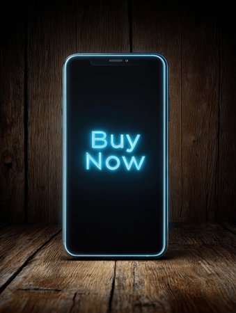 A smartphone stands in a dimly lit setting showcasing the glowing text buy now. The rustic wooden backdrop adds a cozy, inviting feel.