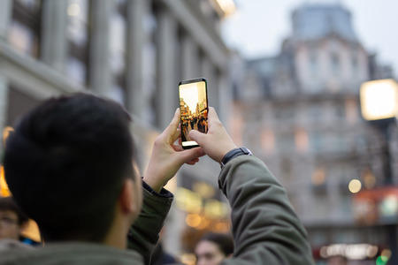 Hands hold a smartphone while capturing the lively essence of a bustling city street decorated with bright lights and colorful bokeh, showcasing the vibrant nightlife and urban energy.