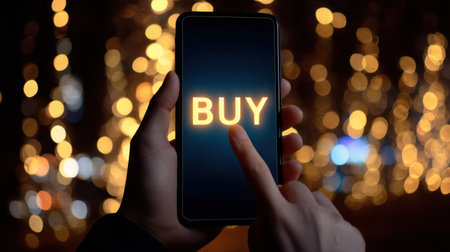 Person is using smartphone to tap on glowing BUY button, surrounded by blurred background of festive lights. scene conveys sense of excitement and urgency in online shopping