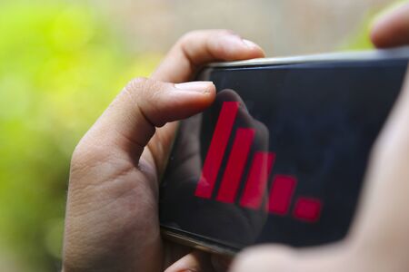 Interactive holographic no signal shining text icon displayed over mobile phone in hands