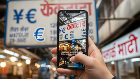 Hand holding smartphone translating a foreign currency exchange rate sign in a market. Clear deta...