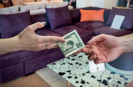 sale of furniture in the store, the buyer pays the cashier for his goods. dollar in hand