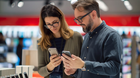 Happy young people shopping new mobile phone in a store. People technology device new concept