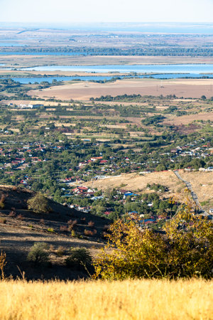 View from the stone walls at the Rupea Citadel (Cetatea Rupea) after renovation towards a small town in Brasov county, in the southern part of Transylvania (Transilvania) region, Romania in summer