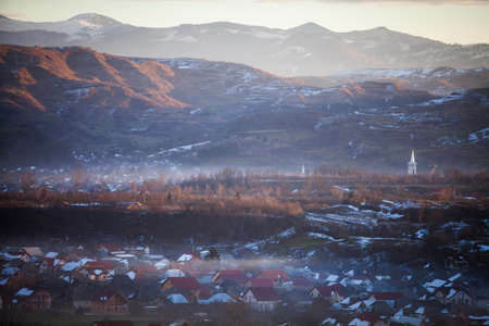 Wintry rural mountain scenery in the valleys of Bucegi mountains in Magura village, Brasov county, Romania. Touristic destinations for winter vacation.