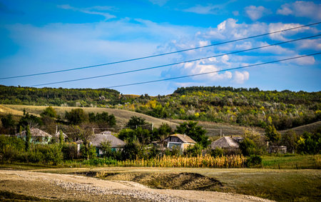 Beautiful landscape with view over the hills and Bahnea village, Mures county, Transylvania, Romania.
