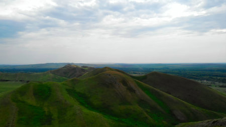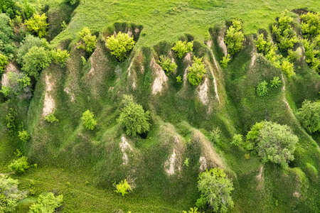 Hills slopes overgrown with green grass, nature reserve Ukrainian Iceland near Vasylkiv, Ukraine. Aerial view