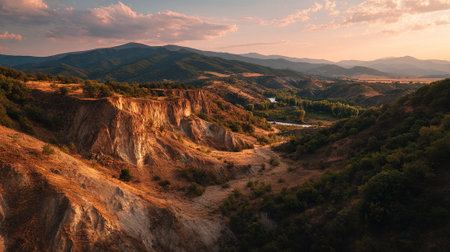 Breathtaking Vista of Mountains and River at Golden Hour in Dramatic Landscape