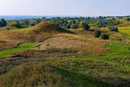 Green chalk hills under blue sky. The archaeological monument - Krapivinskaya settlement, Belgorod region, Russia.