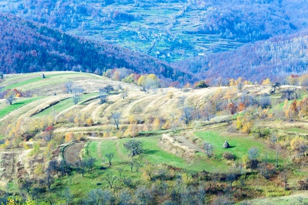 Autumn mountain country landscape with haystacks on hill (Carpathian, Ukraine).