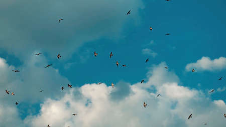 Flock of birds flying in the classic blue sky. Abstract background. Space for text.