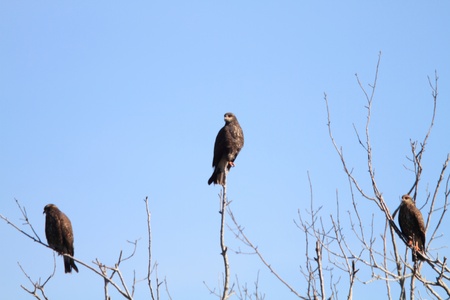 A Flock of Black Kites Lined up on a wall