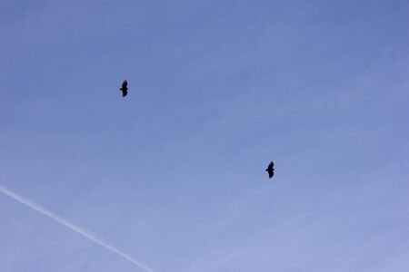 Two Buzzards in one shot flying in the blue sky