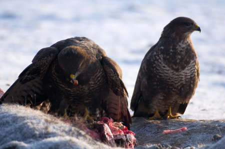 Pair of common buzards on meadow - Buteo buteo