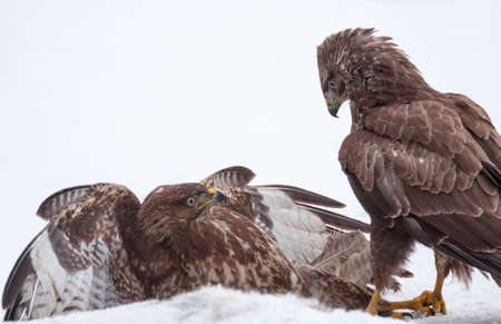Common buzzard (Buteo buteo) is a medium bird of prey, pair on meadow