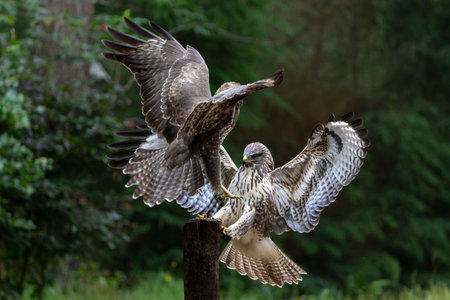 Common Buzzard (Buteo buteo) attacks another common buzzard in the forest of Noord Brabant in the Netherlands. Green forest background