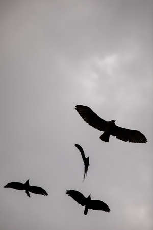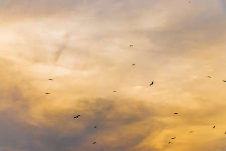 Many Vultures flying in cloudy sky. Silhouette of birds in the sky.