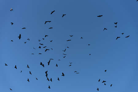Flock of crows in a sky in autumn