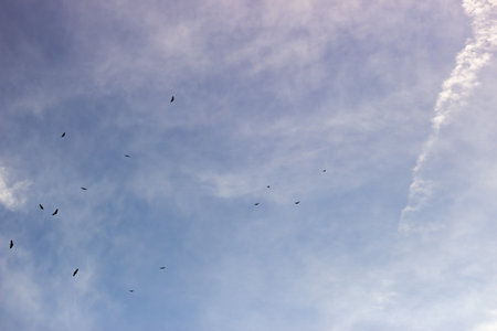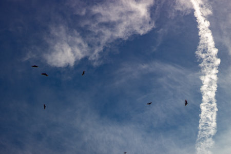 Flock of menacing circling turkey vultures hover high up in the sky