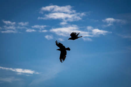 two crows fly in the air, cloudy sky in the background, outdoors