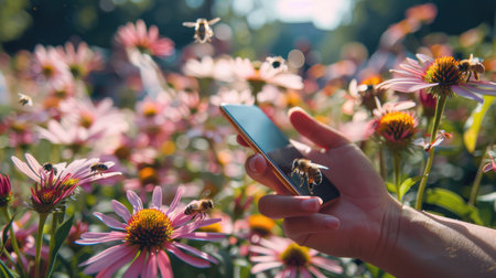 Taking a photo of a bee pollinating a flower in a field of flowers with a smartphone.
