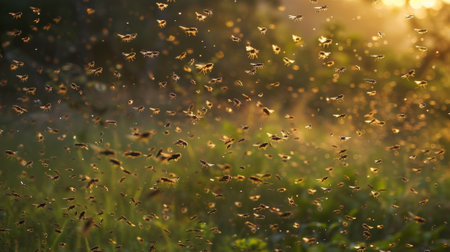 A massive swarm of locusts moving across a grassland their synchronized flight resembling a dark cloud