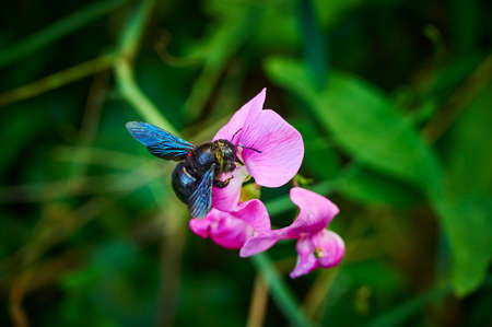 Carpenter bee (Xylocopa) on a vetch (Genus Vicia) in a garden.