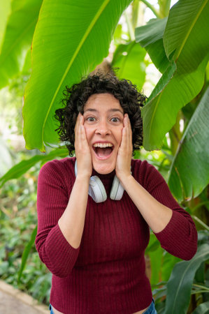 Young student with headphones is enjoying music in a botanical garden and showing genuine excitement