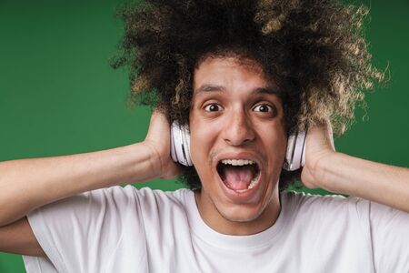 Image of a shocked screaming young curly guy posing isolated over green wall background listening music with headphones.