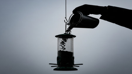 A high-contrast, side-profile image of a person's hand refilling a hanging bird feeder with fresh se