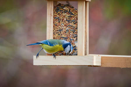 Eurasian blue tit bird ( Cyanistes caeruleus ) eating seeds from a bird feeder