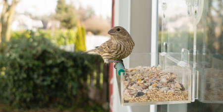 Small bird looks back between feeding on a window mounted feeder