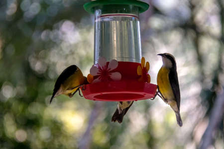 Bananaquit bird (Coereba flaveola) drinking from a flower drinker - Ilhabela, Sao Paulo, Brazil