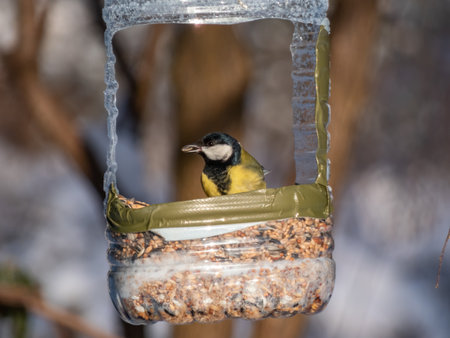 Tits eat sunflower seeds from handmade feeder. Winter feeding of garden birds Great Tit or Parus major. Eco-friendly lifestyle, environmental conservation.