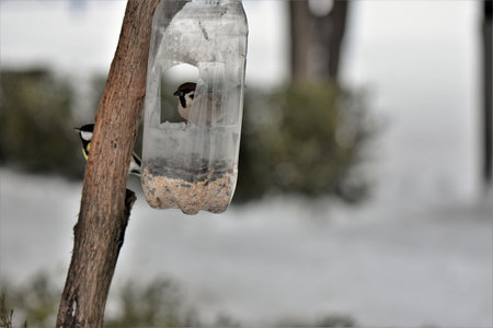 The Great tit (Parus major) visiting bird feeder made from reused big plastic bottle full with grains in winter. DIY plastic bird feeder bottle hanging in the tree