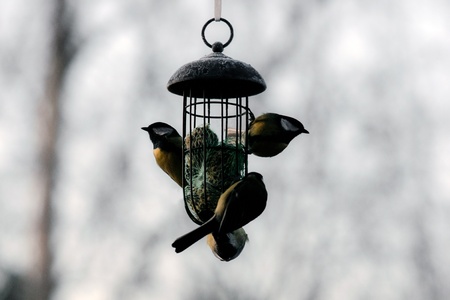 Three great tits feeding of some tallow balls