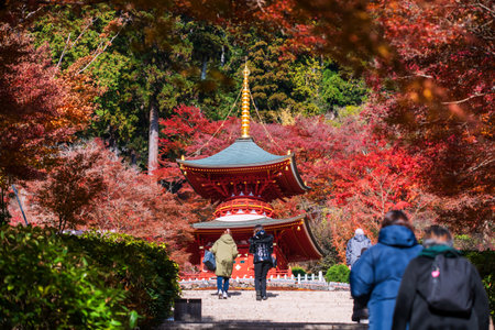 Tourist people walk to Katsuo-ji temple pagoda by colorful autumn foliage garden in December, Minoh, Osaka, Japan. Famous travel destination for sightseeing Kansai in fall. Temple of victory