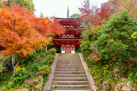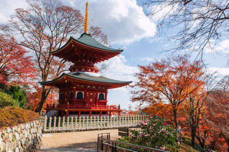 Beautiful red pagoda of Katsuoji temple with colorful maple leaf in autumn garden, Minoh, Osaka, Japan. travel destination for sightseeing Kansai in fall. Temple of victory