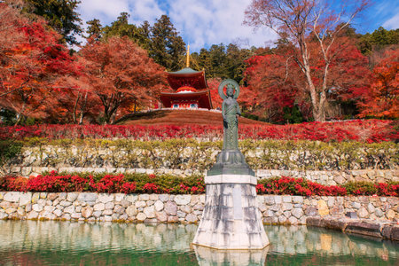 Guanyin statue over pond by autumn leaf garden and pagoda of Katsuo-ji temple in December, Minoh, Osaka, Japan. travel destination for sightseeing Kansai in fall. Temple of victory