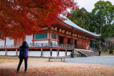 Tourist people photograph Daigo-ji or Daigoji temple hall by autumn leaf garden, Kyoto, Japan. Famous travel destination for tourist in Kansai on peak fall in December.