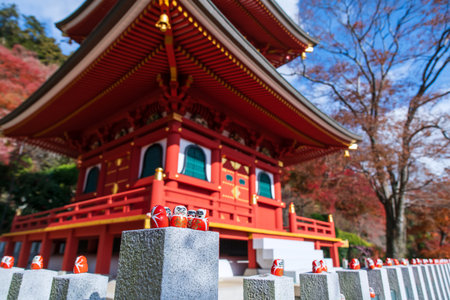 Daruma figurines on stone pillar by Katsuo-ji temple pagoda and autumn red maple leaf colors, Minoh, Osaka, Japan. travel destination for sightseeing Kansai in fall. Temple of victory