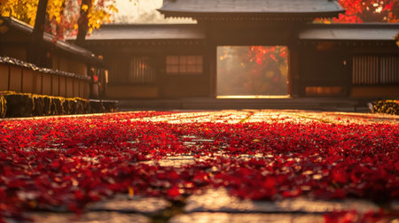 A serene autumn morning featuring a stone pathway blanketed in vibrant red leaves, leading toward traditional Japanese architecture surrounded by nature.