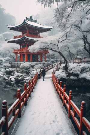 Generative AI : Japan unseen landscape scenic view from yamadera bridge canal yamadera shrine temple yamagata prefecture tohoku region asia with snow mountain valley in winter seas