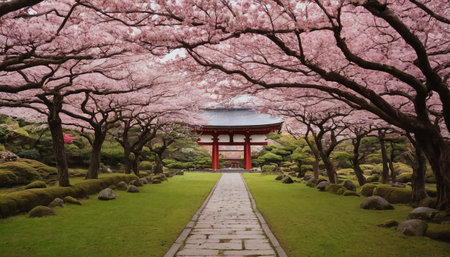Cherry blossoms line a tranquil path to a serene temple in springtime beauty