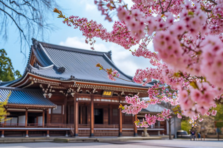 A traditional Japanese temple with cherry blossoms in bloom. (1)