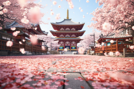 Cherry Blossom Festival in Japan, temple in cherry blossom garden