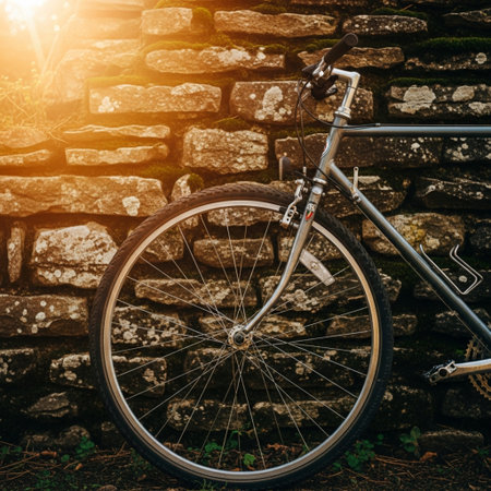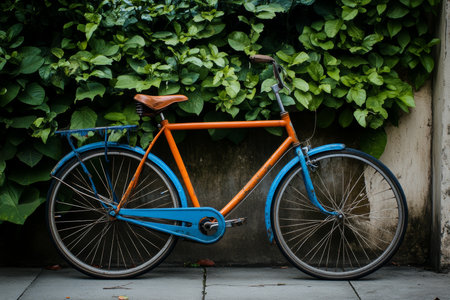A close-up shot of a vintage bicycle parked against a rustic wall, highlighting its intricate details and evoking a sense of nostalgia in urban mobility.