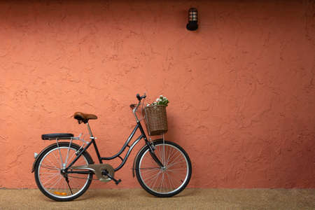 Vintage bicycle with flower basket leaning against rustic wall