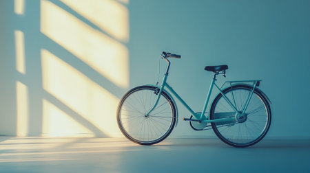 Stylish bicycle near light blue wall
