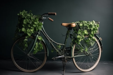 Bicycle with basket full of ivy in front of dark background